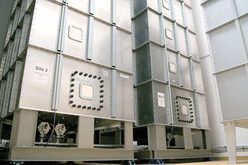 Современные, массивные, надежные. Изготавливаются модульно из листового алюминия толщиной 4 мм на современном оборудовании с ЧПУ. Используются компоненты только ведущих производителей, что обеспечивает срок службы, намного превосходящий средний по рынку. Мощные вентиляторы отвечают за аэрацию и свободный выход в трубопроводы. Опционально силосы устанавливаются на весовые датчики для постоянного контроля за количеством муки.
